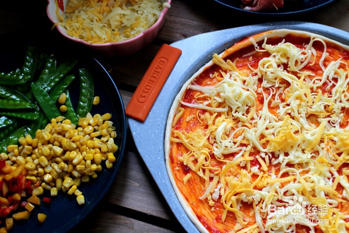 13、把炒好的蔬菜食材平均放在奶酪上
