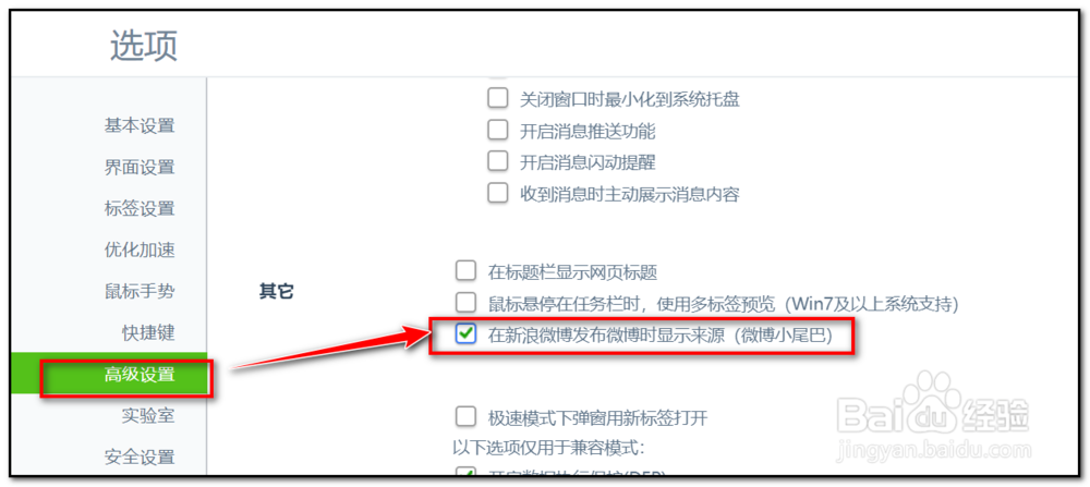 6、在“其他”项目中,去除勾选“在新浪微博发布微博时显示来源(微博小尾巴)”,打开微博此时已经没有小尾巴