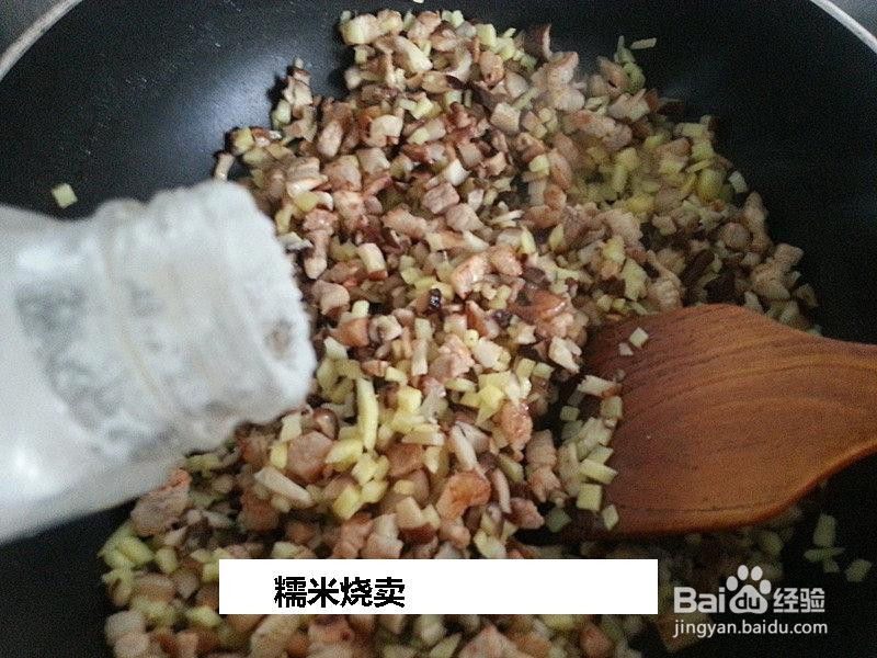 8、在蒸米的同时,我们可以将炒锅烧热,倒如切好的肉丁进行煸炒,直至将肉丁煸炒成金黄色且有些许出油即可。