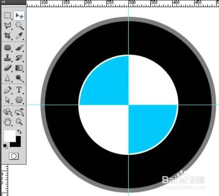 7、 取消选择,Ctrl+单击“蓝片”图层,载入选区,从标尺处拉出水平和垂直两条辅助线居中对齐于蓝色图形,如图。