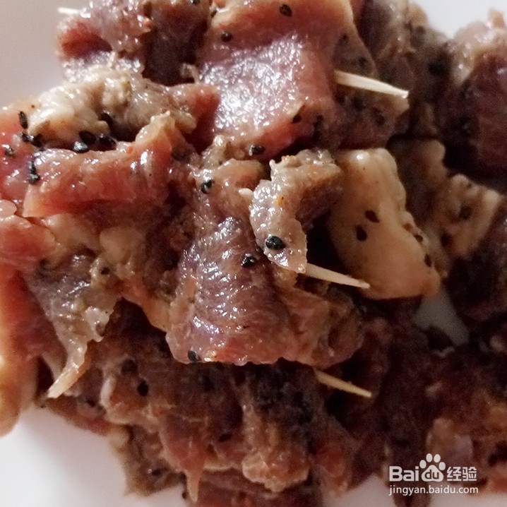 2、羊肉切块,放入盐,白糖,辣椒粉,芝麻,孜然,味素用手抓匀,(用手抓是为了更好的入味)腌制2小时。