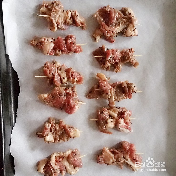 4、烤盘铺好料理纸将串好的羊肉串放上。