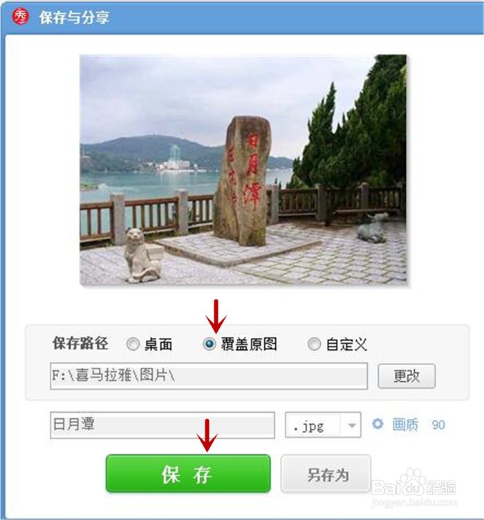 6、在弹出的"保存与分享"界面中,鼠标选中"覆盖原图"单选按钮,然后点击"保存"按钮