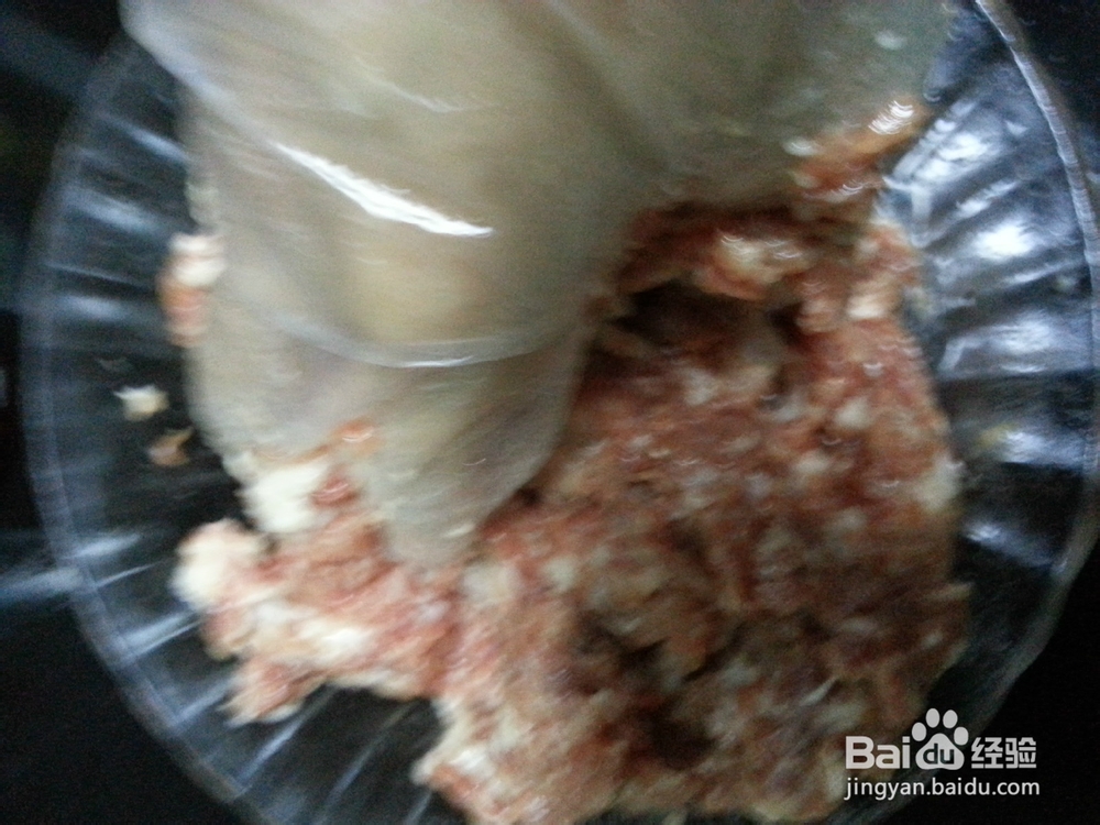 3、把肉末放入碗中,撒入适量黄酒,盐,生抽还有白糖,然后带上一次性 手套搅拌均匀,静置15分钟入味