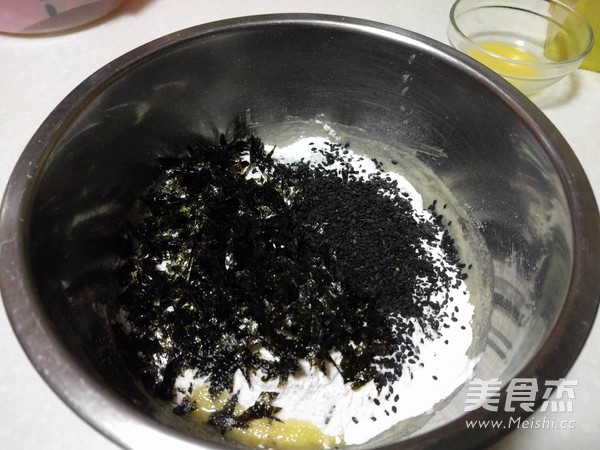 6、加入低筋面粉、海苔和黑芝麻