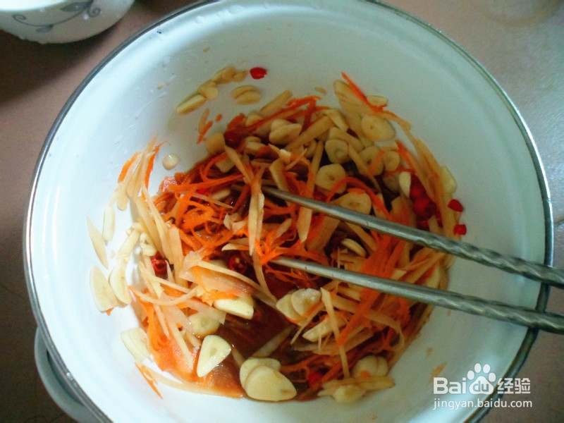 5、在小锅里头加入两勺食用油,加热,将热好的食用油洒到食材里头,本人觉得热好的油会香点,加到食材里头味道会更好,当然不热都行。加少许味精和盐,继续搅拌!然后,当当当,各种香!这就是成果啦!一边放着腌制放凉,等两个钟!Yes,可以开吃啦!