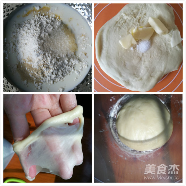 1、除黄油和盐外所有材料放在一起,揉至扩展阶段,在加入黄油和盐,揉出手套膜,正好行进行发酵;