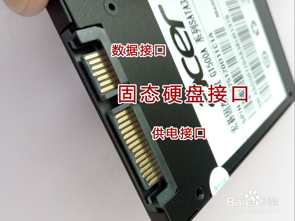 2、然后,将固态硬盘的接口连接电源线和数据线。要一次性插进去,只要两者处在同一个水平,就能一次性插进去。