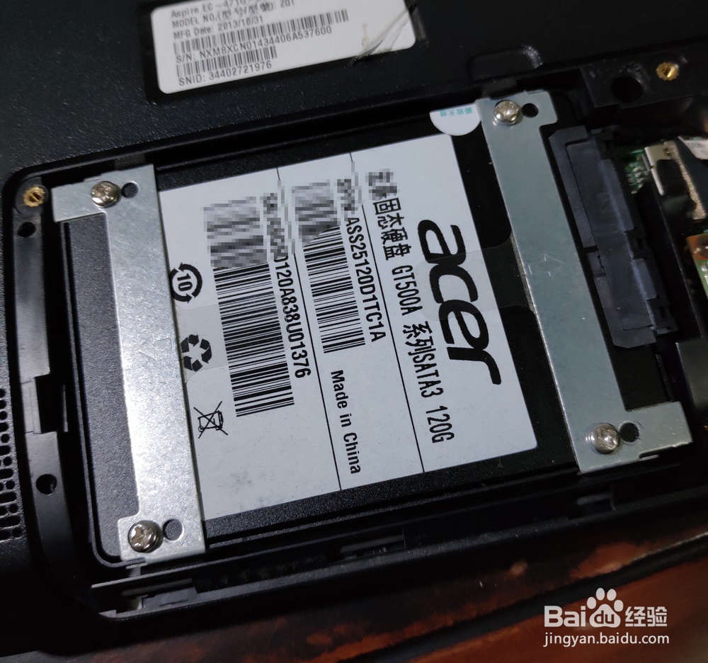 4、然后小心翼翼的拿起硬盘,不要磕碰。我们可以看到此时,连接硬盘的数据线和供电线。我们要轻轻的将它们一起拔下来。
