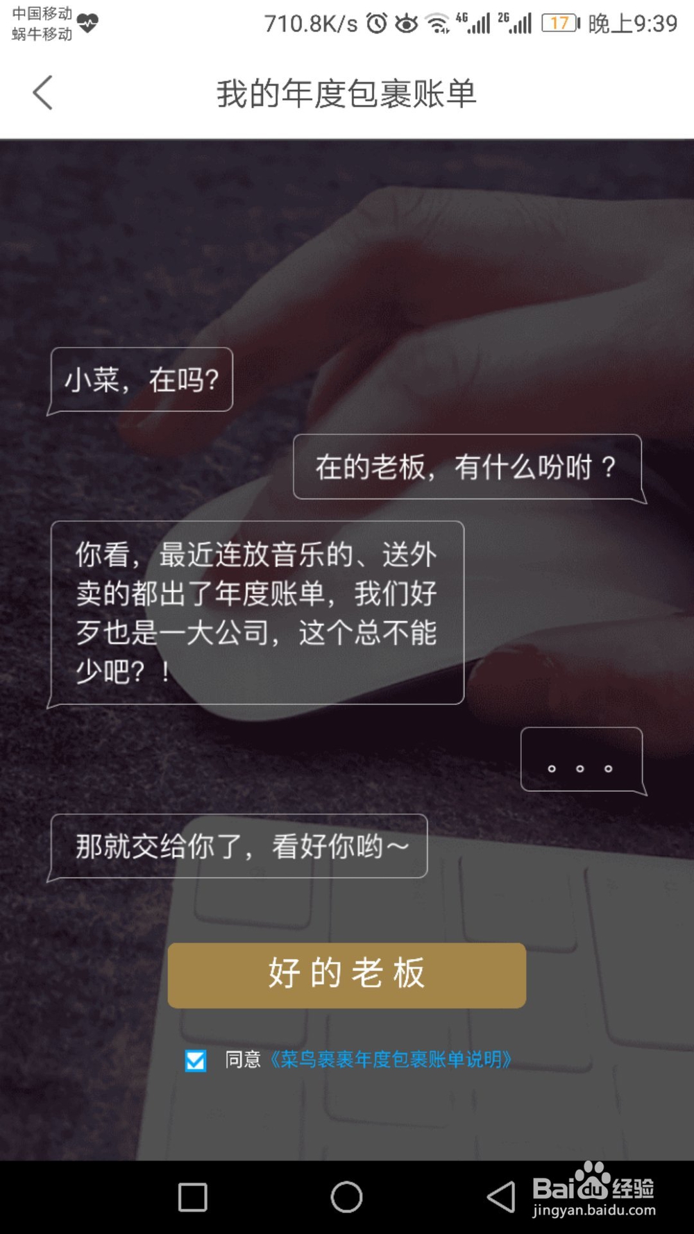 4、勾选同意菜鸟裹裹年度账单说明,点击“好的老板”