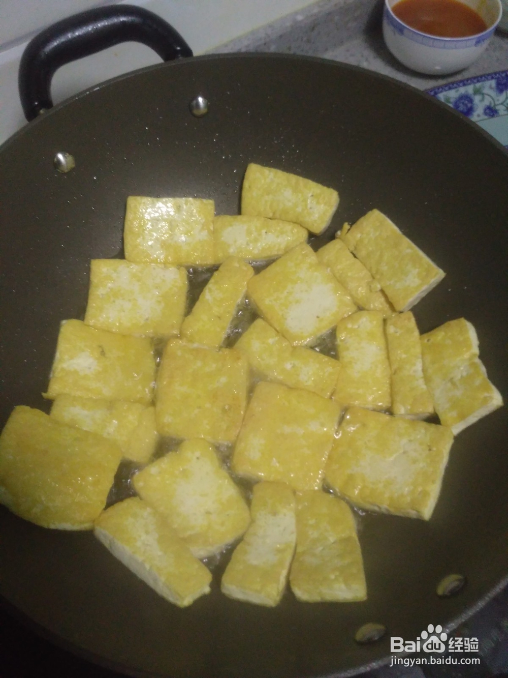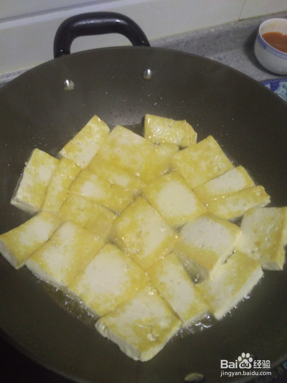 3、锅内放油,用不粘锅的材料更好。然后用筷子一块一块的放入豆腐,火不宜过大。待全部豆腐放进去之后再加大火。