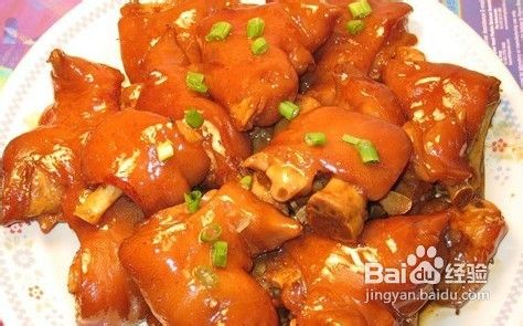 5、料酒、葱、姜、盐、花椒,汤烧开后除去浮沫,用大火烧至猪蹄上色后,移至小火炖烂,收浓汁即成。