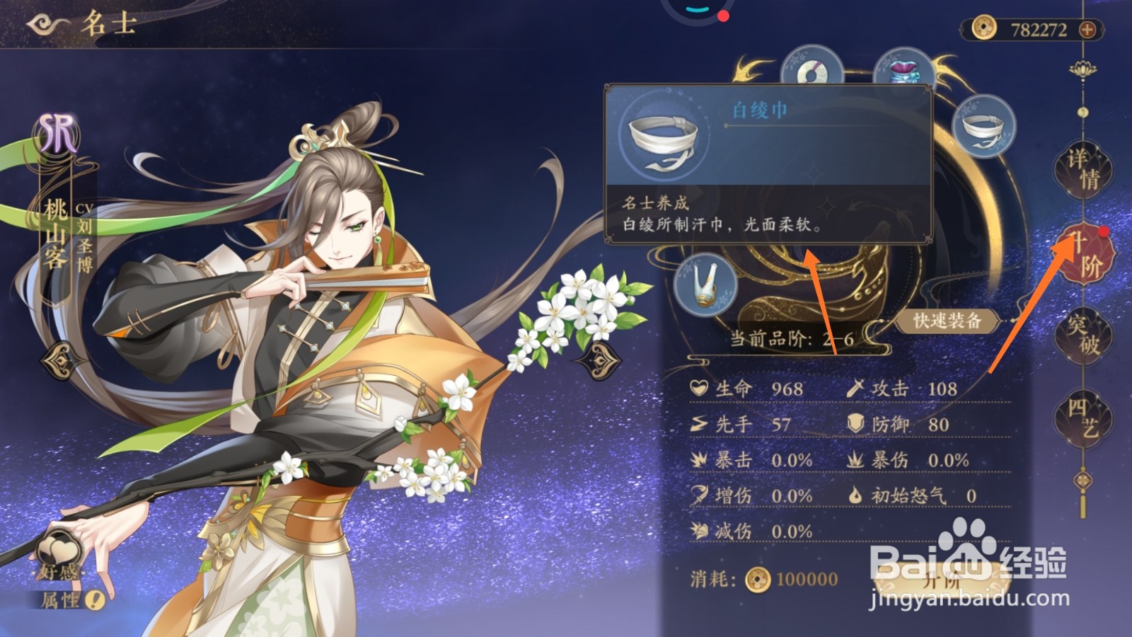 3、在打开的详情页面,点击右侧的升阶,即可查看白绫巾。
