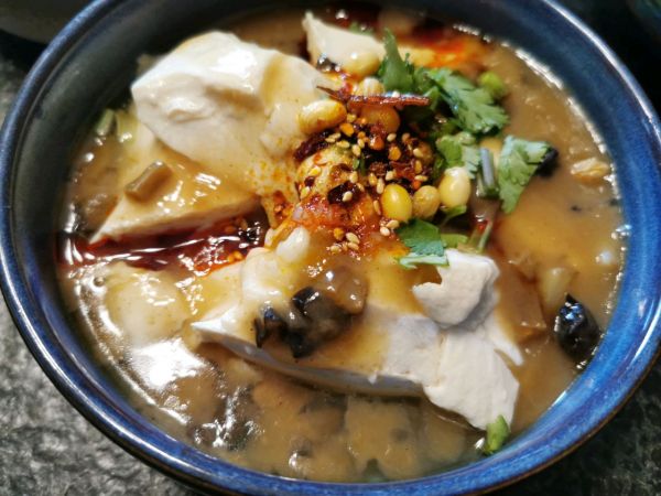 9、卤汁的具体做法:黄花菜和木耳提前泡好,锅内爆香葱姜蒜,倒入一大碗水,放入木耳和黄花菜,加盐,五香粉煮熟,最后勾芡出锅,调料我还加了蒜水,生抽,醋,辣椒油,香菜