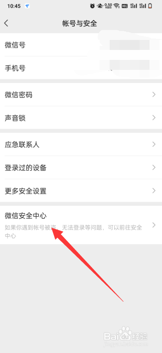 2、在账号与安全中点击“微信安全中心”。
