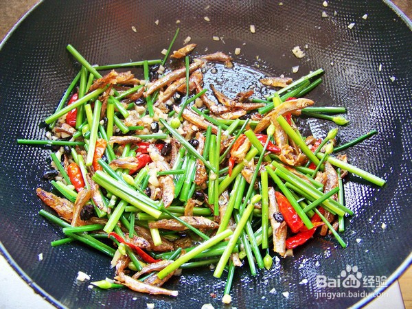 7、放入火焙鱼,加鸡精、盐翻炒调味
