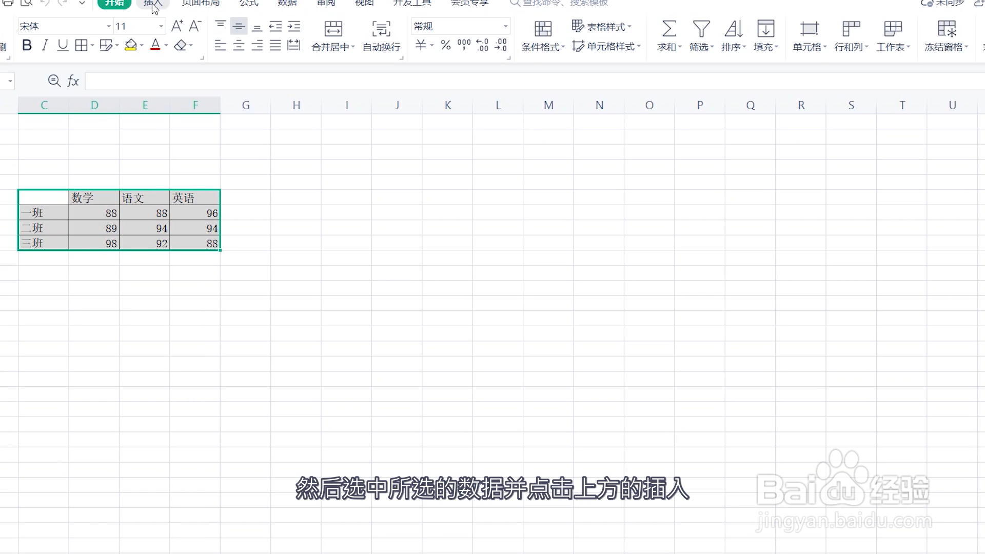 2、然后选中所选的数据并点击上方的插入。