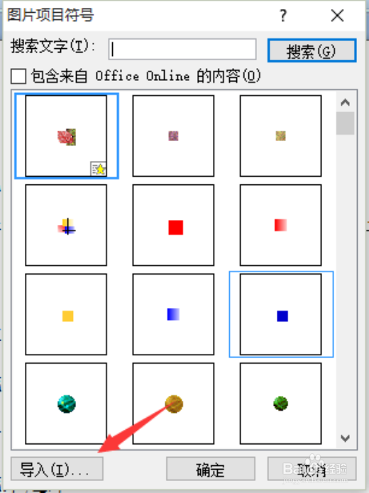 5、在弹出的”图片项目符号“窗口中,点击【导入(I)】按钮。如图所示;