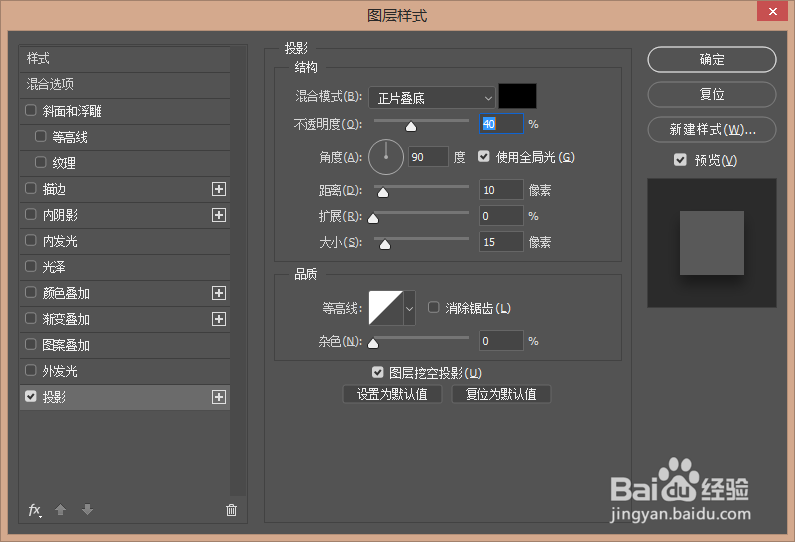 4、双击文字图层打开图层样式,选择“投影”数值如图