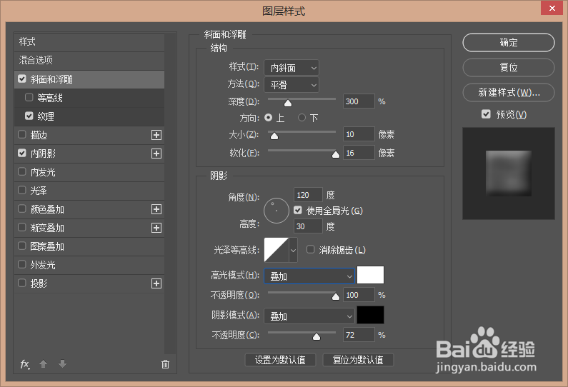 16、选择“斜面和浮雕”里的“纹理”数值如图(这里需要添加一个巧克力纹理,到最后面的链接里下载哦!)