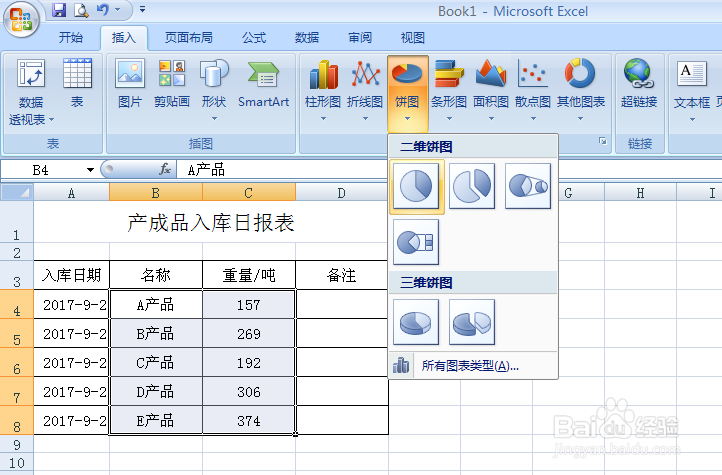3、如图所示弹出“设计”菜单,可以任选一个饼图的样式。