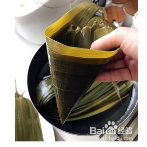 5、用粽叶的尾巴像图片上翻过去把粽子底部包住,这样底部就不会漏米了