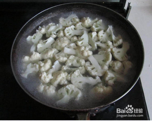 菜花撕成小朵后,放在淡盐水中浸泡5分钟,洗净后沥干水分。