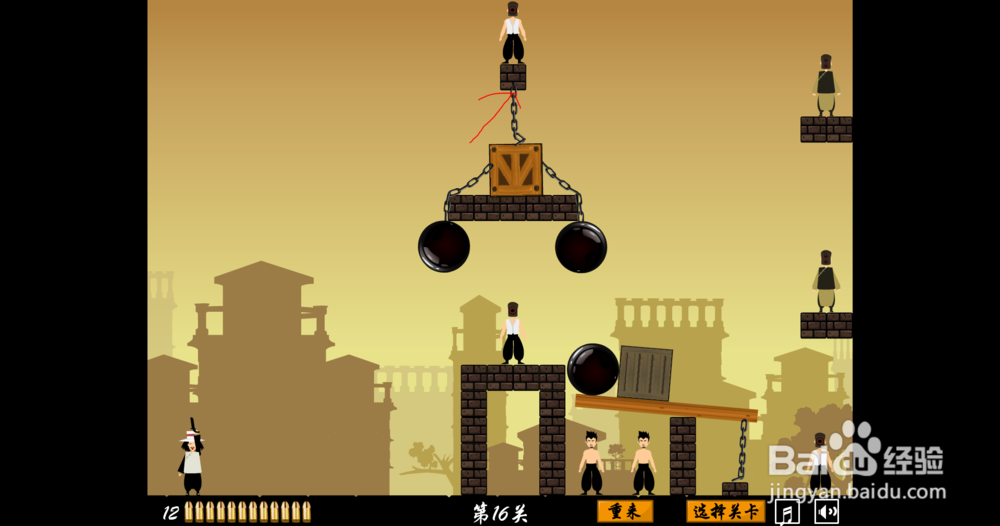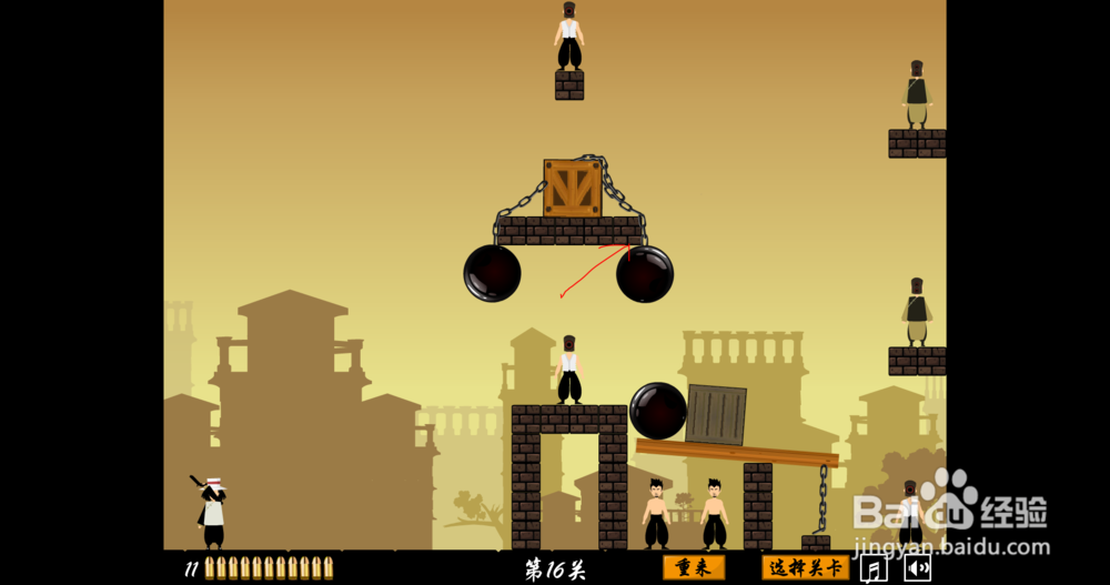 3、瞄准右边链球上的链子,射击,结果,链子未打断,子弹反射歪打正着将下方土匪击毙,接着击中下边铁球,铁球向右滚下,将右下方土匪砸死。