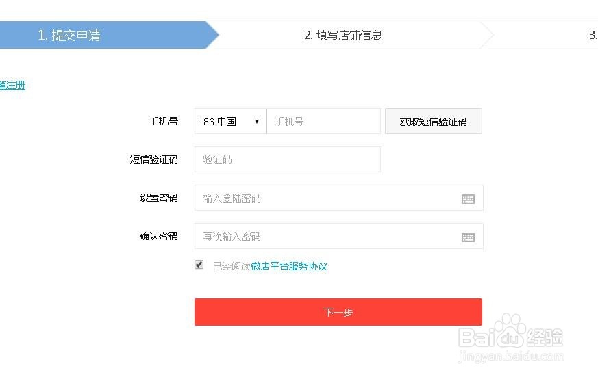7、不管是手机号注册,还是邮箱注册,都是能直接到填写店铺信息的,(名字请慎重,注册成功,不可修改)