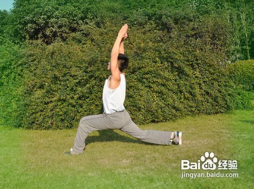 动作要领:两手与两膝接触地面,右脚向前迈一步,放于两手拇指相扣合掌伸直在耳朵两侧,形成弓箭步,伸直上身,双臂屈肘吸气,在伸直左腿的同时用前掌蹬地,两臂向上方伸展,身体后弯,保持该姿势约30-60秒,然后换另一侧重复练习,每侧练习两次。