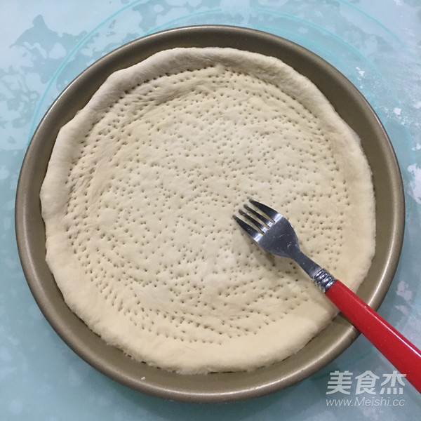 7、移入不粘披萨盘中,稍微整理一下,使其外边一圈比里面厚。