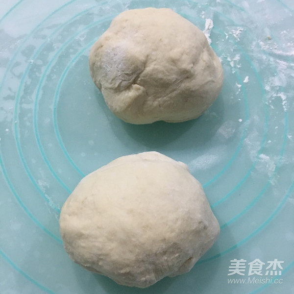 5、取出排气,分割成2份,盖上保鲜膜松弛15分钟。