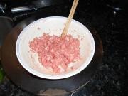 4、夹心肉用刀剁成肉泥,放入调味料拌匀,分次加入2大匙的水顺时针搅上劲。