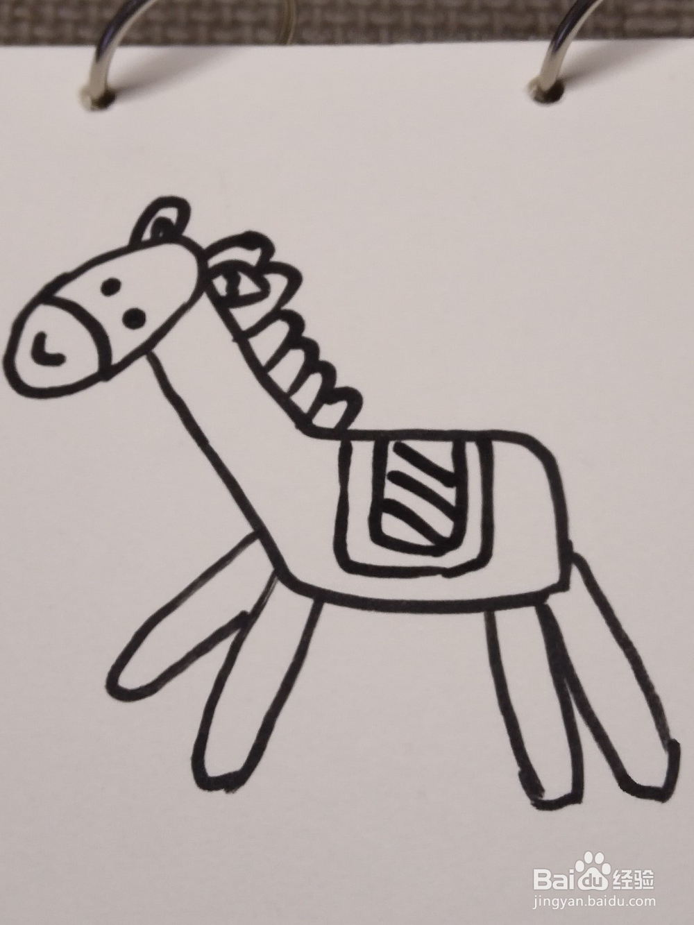 6、最后画出小马身上的坐垫,一个长方形,画一些平行的线做装饰,最后画出它的尾巴,就完成了。