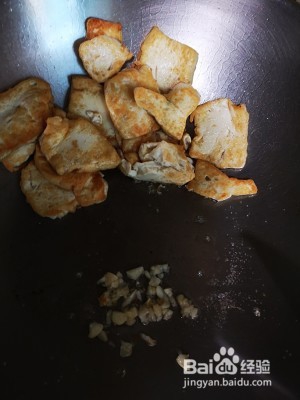 4、把豆腐拨到一边;放蒜蓉;盐爆香后再放点点水;酱油(我是因为懒得再盛出来装盘)喜欢吃辣椒的朋友也可以自行加辣椒跟蒜蓉一起爆哦!