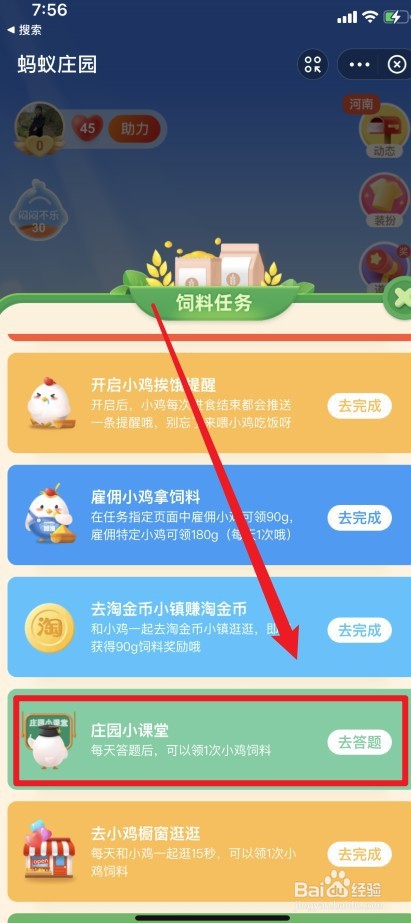 1、在支付宝软件界面,点击进入蚂蚁庄园里,选择领饲料。