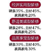 按照装修预算硬装28%,主材47%,家具家电25%分配,硬装花费跟经济实用型花费差不多,最多增加部分造型花费,主材配置比经济实用型要好,大致花费在5万元左右,再用3万多元购买家具和家电。