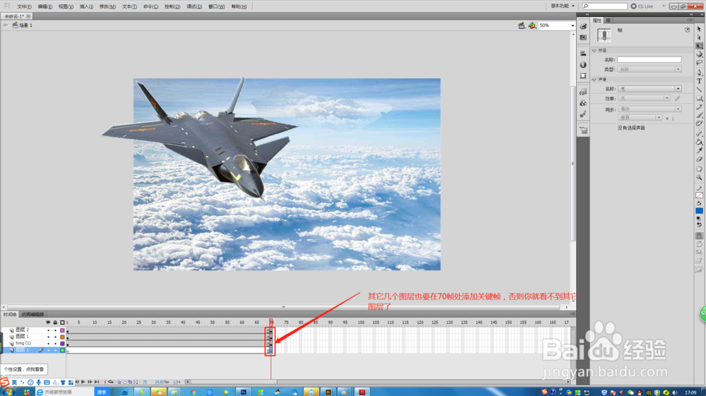 选择飞机图层,将时间滑块调到70帧处,如图所示,点右键,插入关键帧,其它图层也要在70帧处插入帧或者关键帧。如果不插入帧,你就只能看到飞机,其它图层就看不到了。