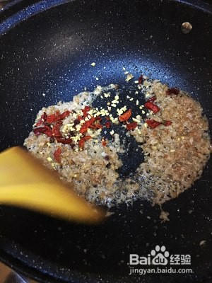 6、将油倒出,锅里留少许底油,放入辅料,炒制有干海椒的呛香味即可