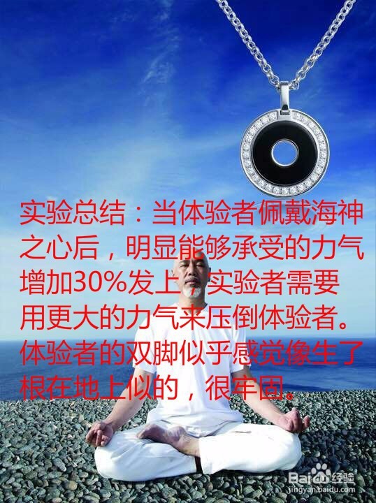 海神之心的神奇之处在于,海神之心可以在不接触物体的时候,传递给物体,我们可以通过传递给地面来进行演示对比。实验的方法可以采用上一个实验,后压实验的方法。但是体验者不需要直接佩戴海神之心,实验者只需要把海神之心在地板上,转几圈,就可以了。先做一个没有在地上转圈的感受,然后再转圈,最后在没有转圈的地板再进行一次后压。一共三次,第一次跟第三次的效果一致,体验者很容易被压倒。第二次在被转过圈的地板上,体验者很难被压倒。可以证明该地板有能量的承在,进一步证明,能量可以不通过具体的物质传递到指定的区域。这也就是我们的海神之心,可以佩戴在脖子上,隔着衣服就可以。