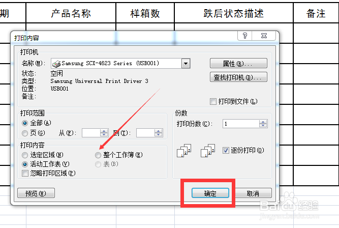 3、选中整个工作簿,然后点击确定,打印出来。