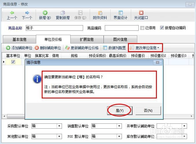 3、在图3中,点击“是”按钮可以进行修改单位名称,示例中是把单位“箱”修改为“斤”,修改后显示为: