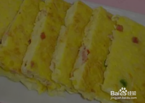 2、鸡蛋打散,玉米、碗豆清洗后备用,火腿切成小粒。