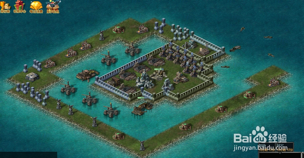第二种,也是先观敌情,如果分布属下图,我们就简称为“散防型”,这种特点是仓库都位于中间,必须用远程武器才能攻击到,那你的舰队分配最好三艘装有毁灭或漩涡,两艘装有高爆类武器,如迫击炮或火龙什么的,近程的攻击塔防,远程的攻仓库,因为进攻时间就5分钟,所以最好同时进行。