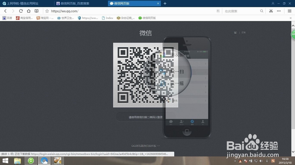2、然后在跳出来的登陆界面上有个二维码,这时候就要先登陆手机微信了,然后用手机微信里的扫一扫那个二维码
