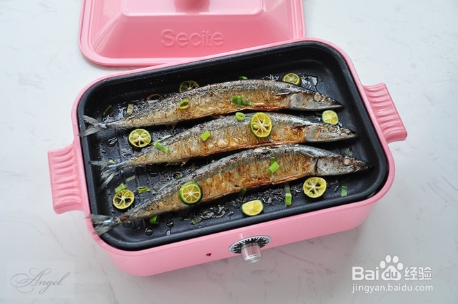 4、放入腌制好的秋刀鱼改中火盖上盖子煎大约1分钟左右。