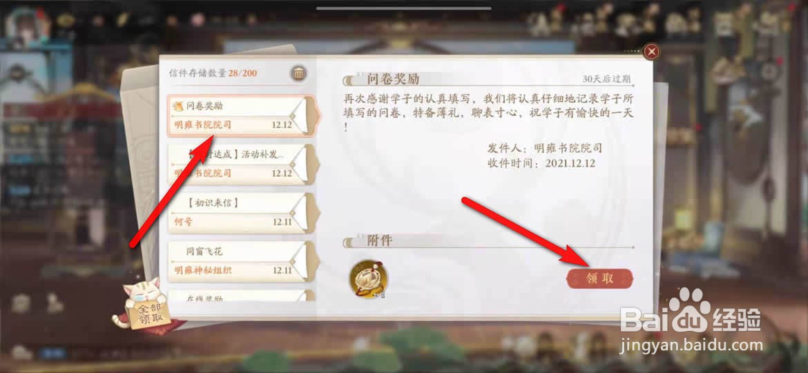 5、前往邮箱,打开问卷奖励邮件,点击“领取”即可获得花诏领奖励。