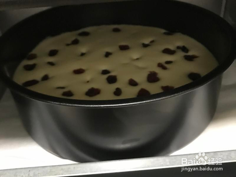 13、把蛋糕液放蛋糕模具的,一定要把蛋糕模具端起来松手放下,把气泡排出来,重复八次十次。我还在上面加了蔓越莓
