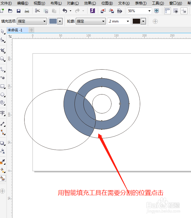 1、打开CorelDRAW ,如图,画布上有多个交叠放置的圆形。