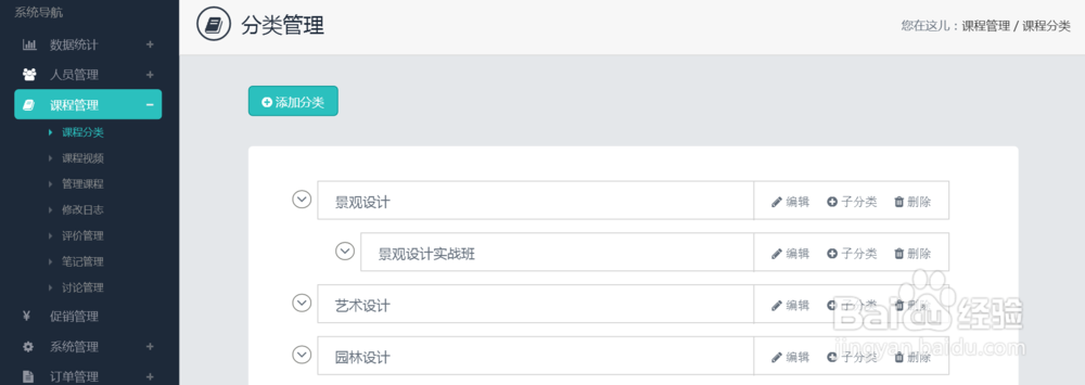 1、您可以在【课程管理】-【课程分类】中添加课程分类,可以编辑、添加子分类和删除。